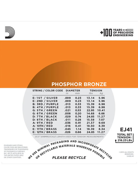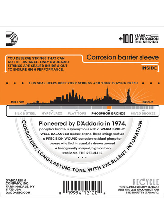 Phosphor Bronze was introduced to string making by D’Addario in 1974 and has become synonymous with warm, bright, and well balanced acoustic tone. D’Addario Phosphor Bronze strings are precision wound with corrosion resistant phosphor bronze onto a carefully drawn, hexagonally shaped, high carbon steel core. The result is long lasting, bright sounding tone with excellent intonation.