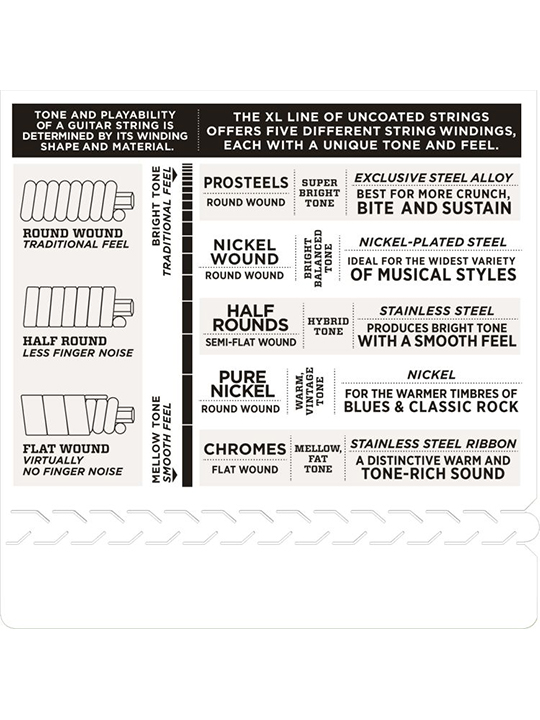- Round wound with nickelplated steel for distinctive bright tone