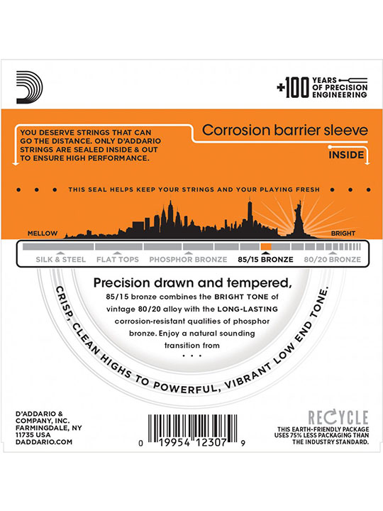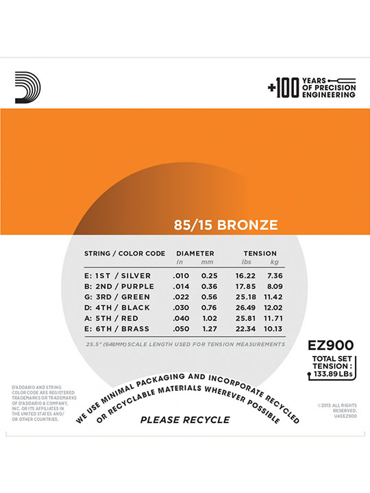 - 85/15 Bronze combines the brilliance of 80/20 bronze with the longer life characteristics of Phosphor Bronze. The 85/15 Bronze wrap wire is precision wound onto a carefully drawn, hexagonally shaped high carbon steel core, resulting in long lasting, bright sounding tone with excellent intonation.EZ900 extra light gauge strings offer easier playability than regular light strings, while maintaining balanced, projecting acoustic tone.