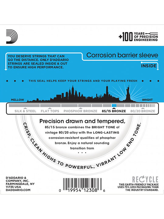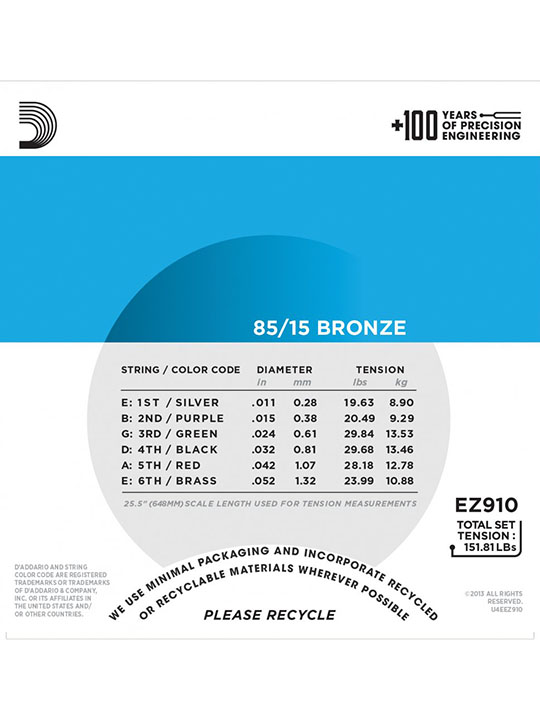 - 85/15 Bronze combines the brilliance of 80/20 bronze with the longer life characteristics of Phosphor Bronze. The 85/15 Bronze wrap wire is precision wound onto a carefully drawn, hexagonally shaped high carbon steel core, resulting in long lasting, bright sounding tone with excellent intonation.EZ910 strings are a D’Addario original hybrid gauge and a comfortable compromise for players who want the depth and projection of light gauge bottom strings, but slightly less tension on the high strings for easy bending.
