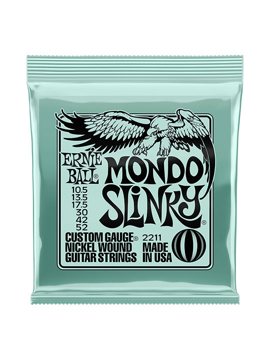 - สาย Mondo Slinky เหมาะสำหรับผู้เล่นที่ชอบเสียงต่ำและมีความตึงหรือขนาดต่างจากเบอร์ .010 มาตราฐานเล็กน้อย Gauges .0105, .0135, .0175, .030, .042, .052