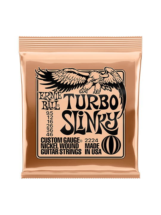 - Turbo Slinkys มีขนาดและความตึงอยู่ระหว่าง Regular Slinky และ Hybrid รุ่นยอดนิยม ให้ความลื่นไหลและความรู้สึกสมดุล ชุดนี้เหมาะสำหรับผู้เล่นที่กำลังมองหาการเพิ่มความสามารถในการเล่นที่มีความแตกต่างน้อยที่สุดในโทนเสียงและความตึง Gauges .0095, .012, .016, .026, .036, .046