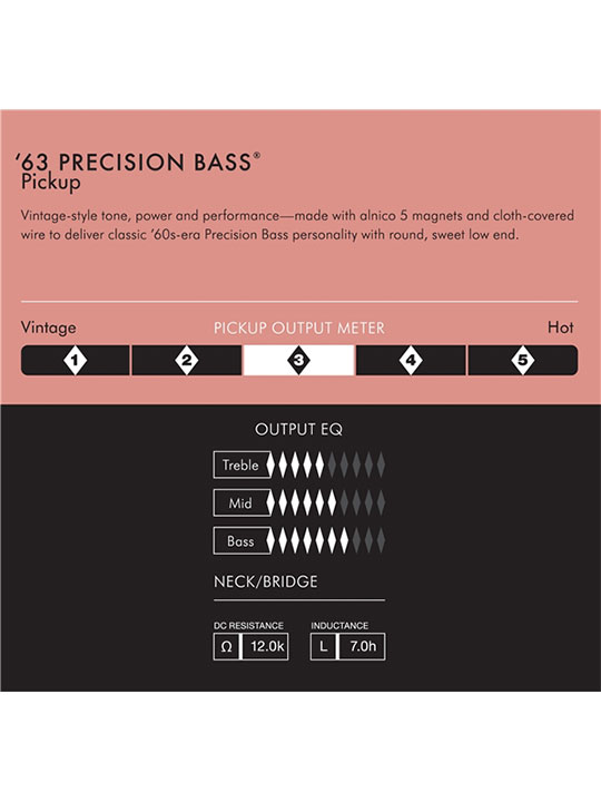 - Fender Pure Vintage pickups ทุกรุ่นมีคุณสมบัติที่แม่นยำสำหรับโทนเสียงและประสิทธิภาพของFender แบบดั้งเดิม ด้วยคาแลคเตอร์ของพรีซิชั่นเบสแบบคลาสสิกยุค 60 และเสียงต่ำที่ไพเราะทำให้ปิ๊กอัพที่ทรงพลังนี้มอบโทนเสียงสไตล์วินเทจที่น่าทึ่ง และประสิทธิภาพของ P Bass รุ่นแรกที่ทรงพลัง ซึ่งเป็นเอกลักษณ์สำคัญที่ไม่มีใครเหมือน
