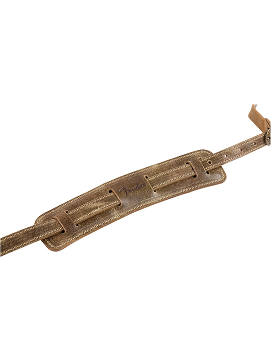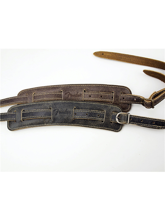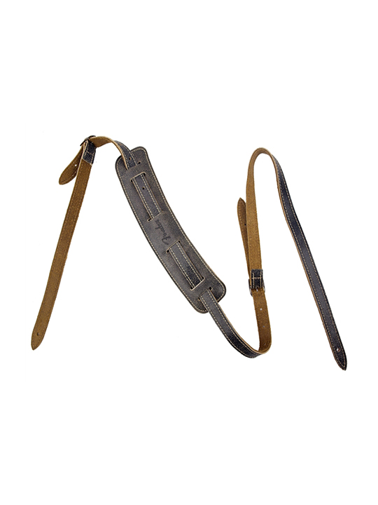 - Enjoy luxurious feel and broken-in comfort with this guitar strap that features an appealing worn, aged and distressed look. The 2.5″-wide pad includes a layer of foam padding so you can play all night long without pain or discomfort from a narrow or unpadded strap. The sturdy 5oz. genuine cowhide top leather sports a heavy waxed glaze finish with a natural-looking worn crackled treatment while the backing is crafted from 5oz. cowhide suede leather. The distressed look is complemented by the antiqued double buckle adjustment that will look great on any stage