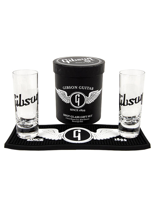 - Keep the bar stocked and the shot glasses handy! Roll out the mat and enjoy your favorite spirit in style! This Gibson Shot Glass Set is a great gift or collectible for your favorite rocker. Each set comes with two hand-blown 2-oz.shot glasses and a matching beverage mat adorned with the “Flying G” logo.