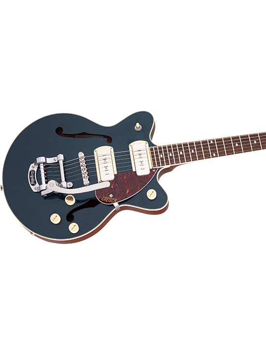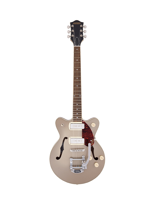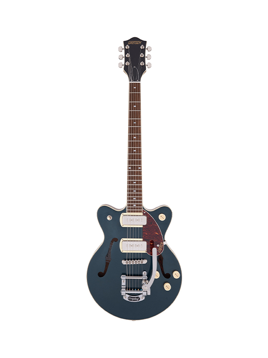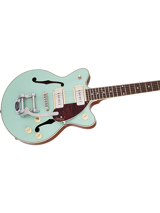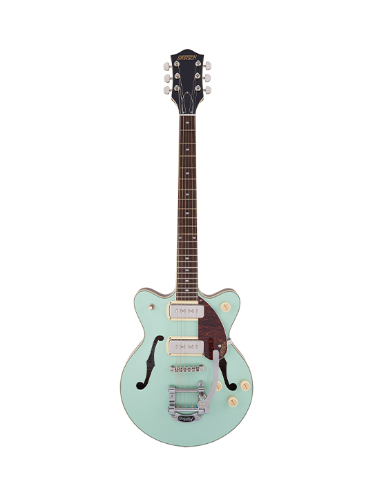 Classic ’50s and ’60s Gretsch eye-catching style is also here – all-new “radio arrow” control knobs, enlarged F-holes for increased acoustic projection, stylized pickup bezels, elegant aged white binding with upgraded purfling, one-ply tortoise pickguard, slick-looking nickel hardware and standout finishes including Two-Tone Midnight Sapphire and Vintage Mahogany Stain, Two-Tone Mint Metallic and Vintage Mahogany Stain or Two-Tone Sahara Metallic and Vintage Mahogany Stain. Easy to play while rocking out thanks to its smaller 14″ body, the G2655T-P90 is a phenomenal instrument for the modern musician who wants to control the stage and the audience while standing out from the pack.