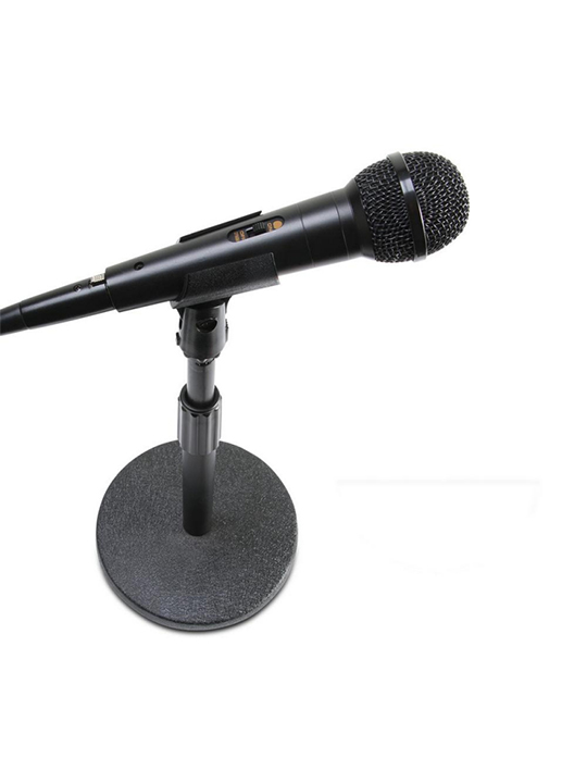 Our DS7200B Adjustable Desktop Mic Stand excels at short-height miking applications. The removable straight shaft adjusts in height from 9″ to 13″ and mounts standard mic clips and accessories. A heavy base provides stability and balance for reliable mic support. Nonslip rubber feet reduce vibrations to prevent mic rumble. A model of functional simplicity, this stand makes quick work of setting up a mic on a desk or podium.