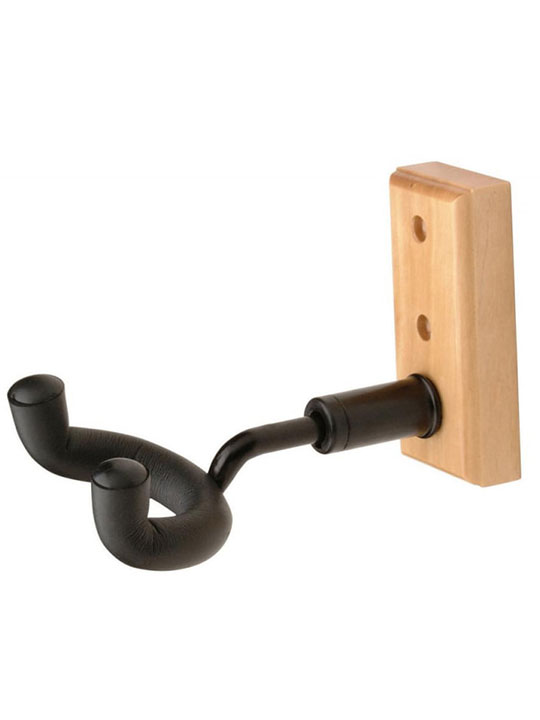 - This wall hanger can be mounted with 2 screws (included) and is designed to hold most guitars by their headstock. The yoke assembly swivels to allow the guitar to hang straight. Constructed from solid pine and steel and features a black EVA rubber yoke.