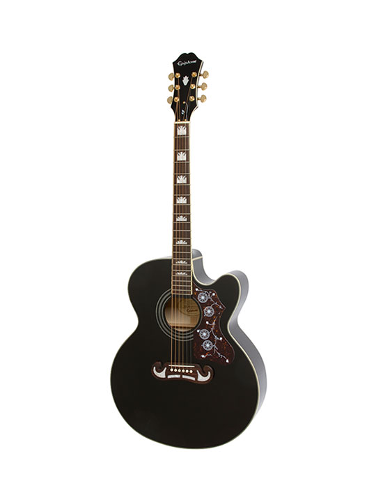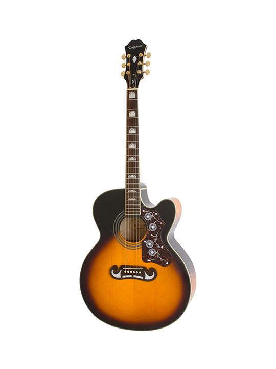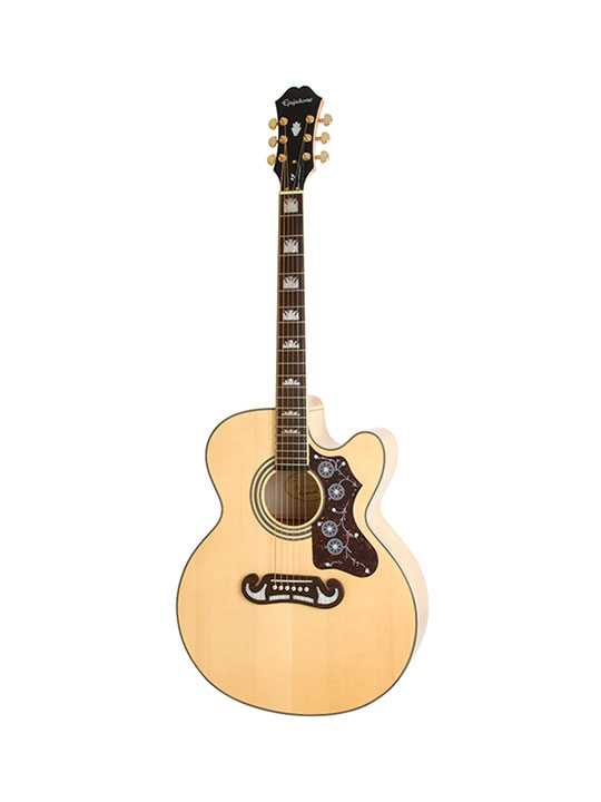 - The J-200 EC pays homage to the King of the Flattops – the classic Gibson™ SJ-200. This Inspired by Gibson Epiphone features a cutaway Super Jumbo body with select maple back and sides, solid spruce top for outstanding tone, a smooth-playing hard maple neck with a SlimTaper™ D profile, pau ferro fretboard, 20 medium jumbo frets, and classy pearloid crown inlays. The bridge has the legendary Moustache™ shape and the pickguard features iconic J-200™ graphics. Comes equipped with a Fishman® Sonicore™ under-saddle pickup and Presys™ preamp with built-in tuner. (Previously called Epiphone EJ-200SCE Acoustic/Electric)