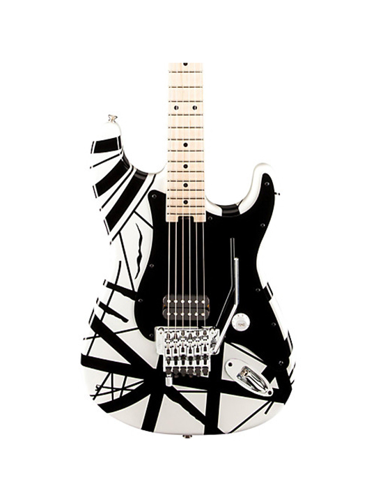 “tone”), single-ply black pickguard (white with black stripes model only), bar string retainer and Floyd Rose® locking nut, EVH-branded Floyd Rose® locking tremolo with EVH D-Tuna®, EVH die-cast tuners, chrome hardware, vintage-style strap buttons and EVH neck plate.