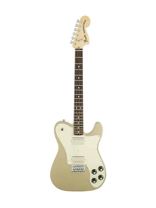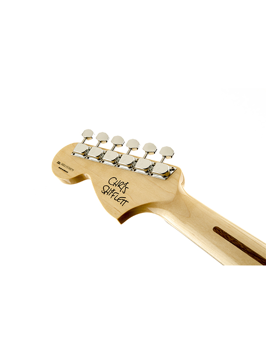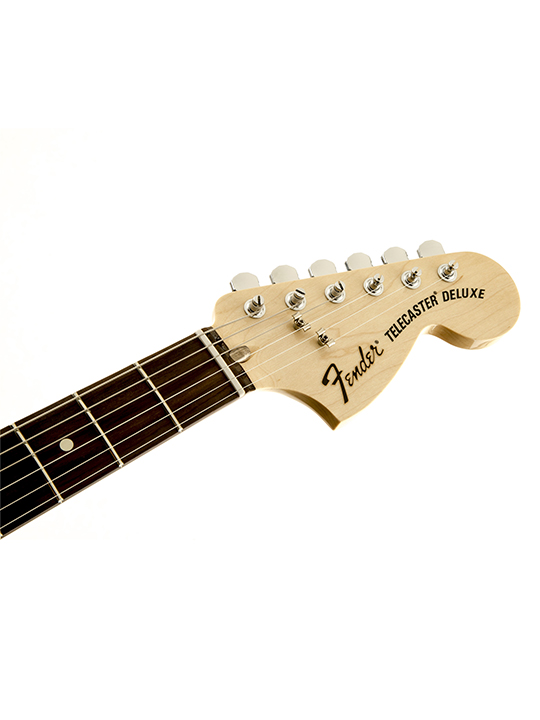 Chris Shiflett’s Telecaster Deluxe model features the nicely authentic touch of sealed tuners stamped with the stylized capital “F” from the classic Fender script logo.