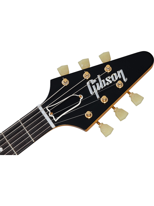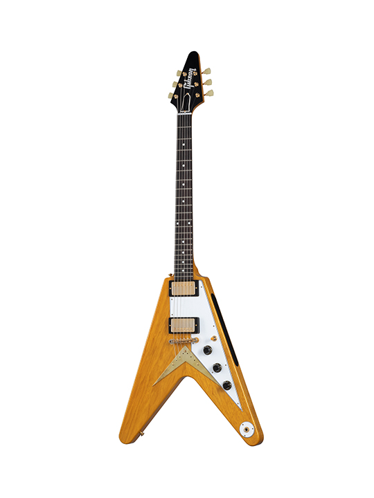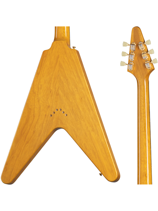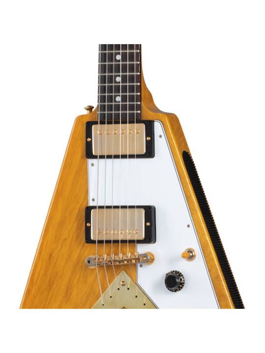 - The Gibson Flying V™ was way ahead of its time when it was introduced in 1958, and only 81 were shipped that year, but it has become very popular in the years since then. The classic vintage Flying V features have been carefully recreated in this Historic Reissue model. Featuring an ABR-1 bridge with a string-through korina body, Custombucker pickups, korina neck, Indian rosewood fretboard, two volume and one tone control with CTS® pots and a phone book capacitor, gold hardware, Kluson® tuners, and a 4-ply pickguard. A historically accurate case is included, with a classic brown exterior and plush pink interior.